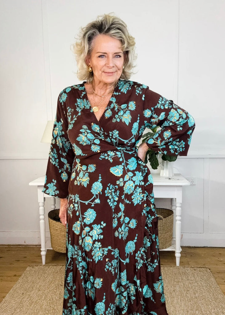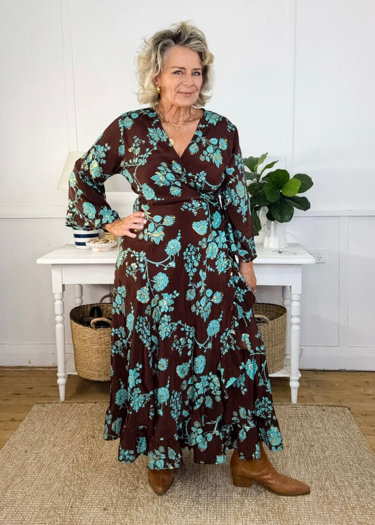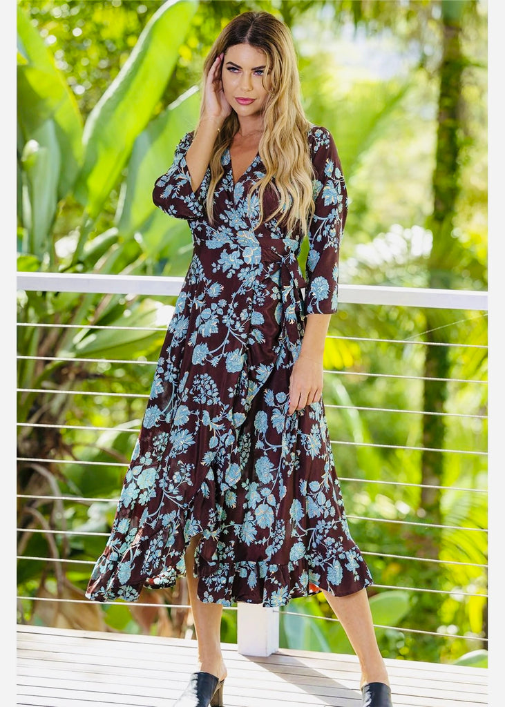 The Brandy Wrap Dress has a stunning chocolate brown background with aqua floral and gold fleck detail. This dress has 3/4 sleeves and a lovely frill on the side. This dress is one of our best sellers! The Brandy Wrap Dress is a silk blend 30% and 70% polyester.